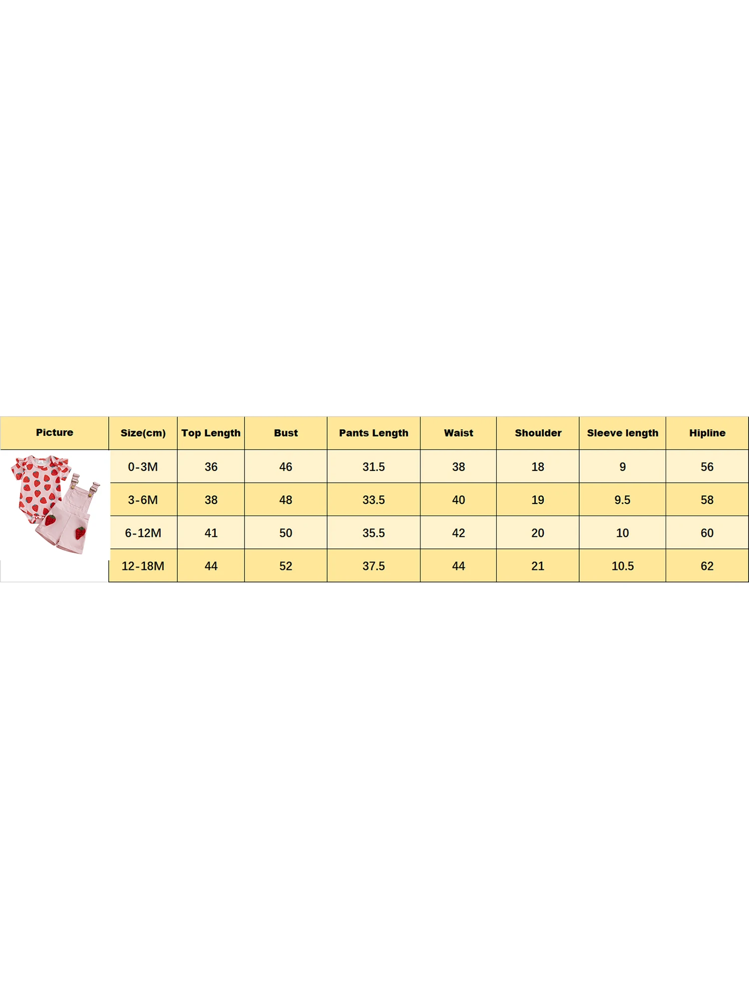 Baby girl shorts set with strawberry print and embroidery; Baby girl romper with ruffles and short sleeves and round neck; baby girl overalls shorts with adjustable straps, cute and comfortable, your little one will receive a lot of compliments wearing it